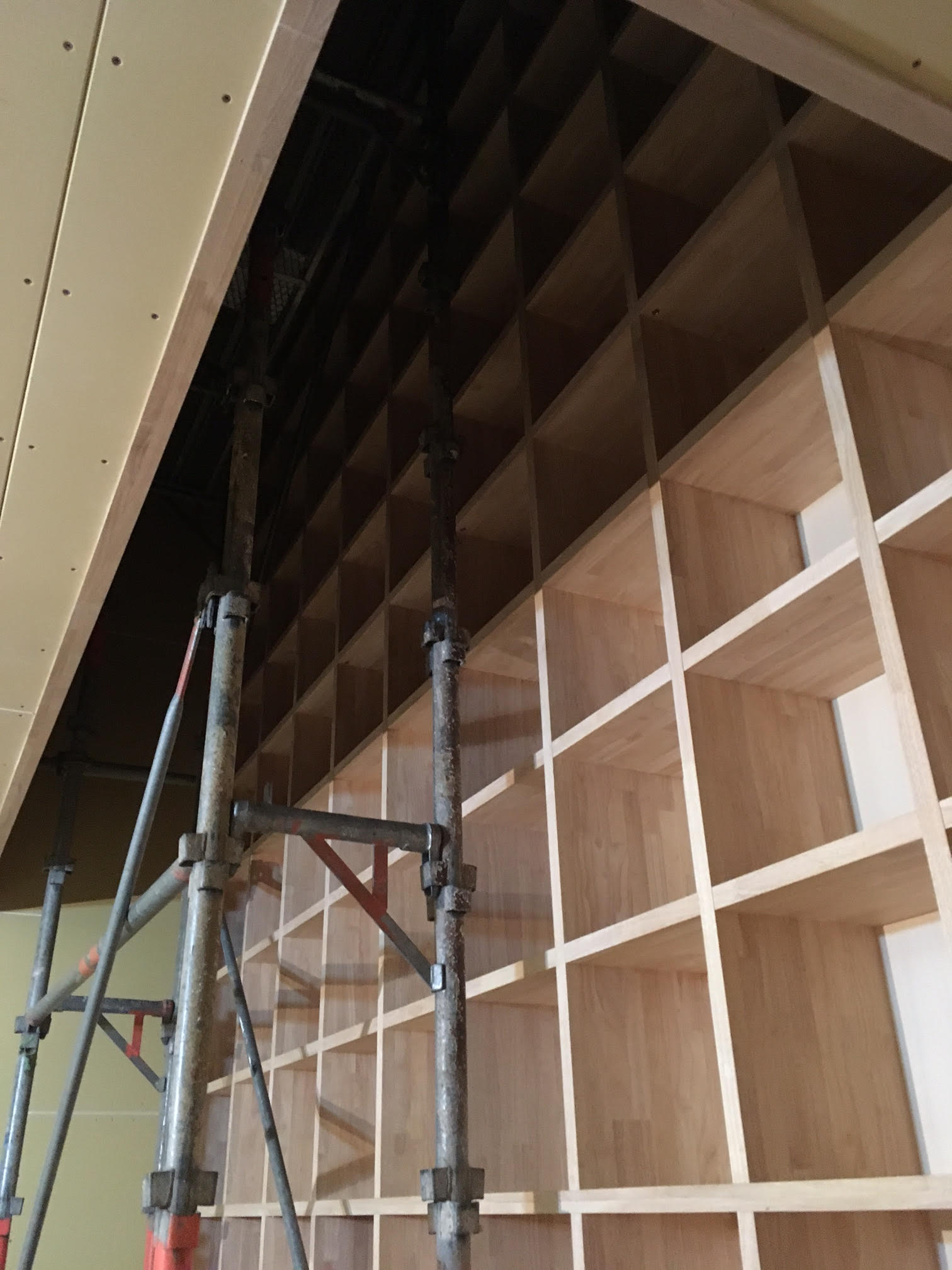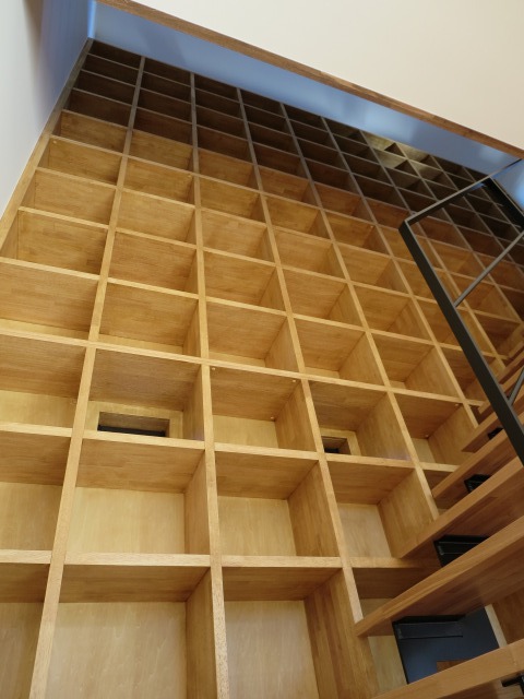 実際は苦労しました。足場が取れ、階段が付いて、壁が仕上がり、家具が塗装され、完成後の本棚は建物の中で圧倒的な存在感を放っていました。当初、撮影は5分~10分位で終わるだろうと軽い気持ちで考えていましたが、気が付くと優に30分は写真を撮り、細部を確認し、全体を眺めていました。