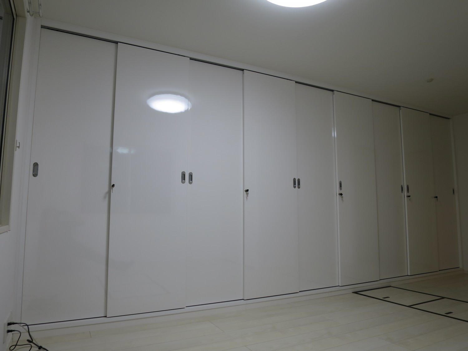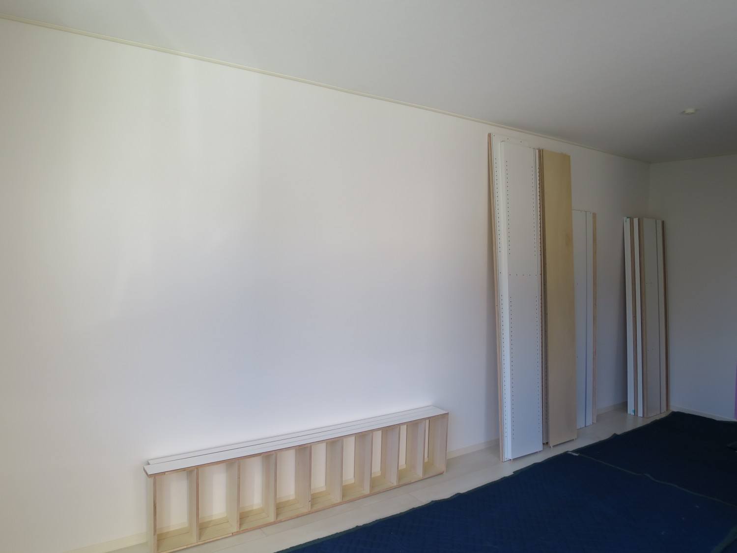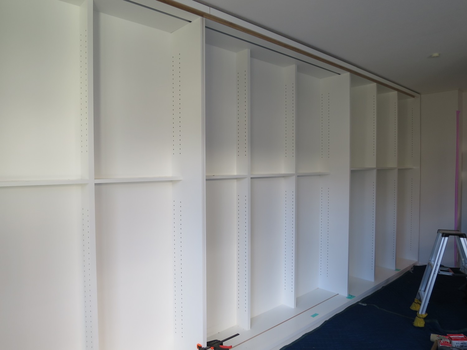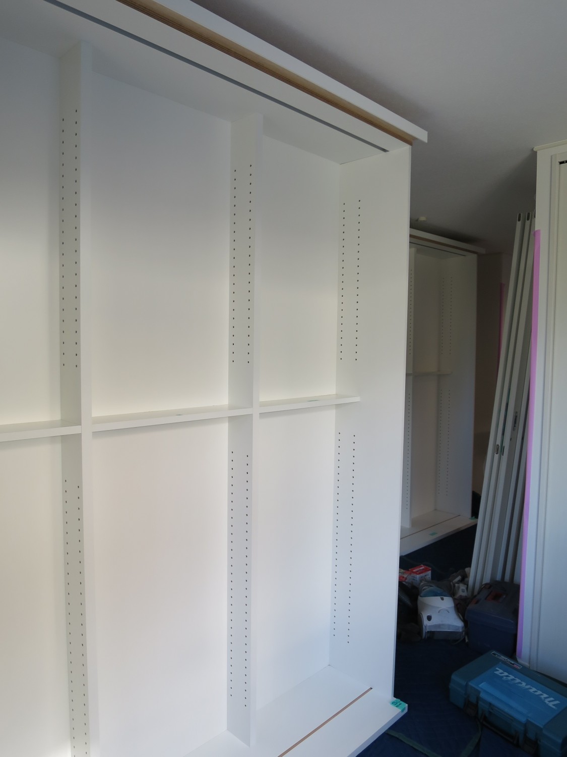 9列の本棚と4つのスライドボックス、そこに今回は鍵付きの引き戸が9枚。本棚というよりは『書庫』です。幅が550センチ、高さは240センチ、奥行きは42センチの大容量です。今回一番考慮した点は『奥行』です。当初は扉9枚のうち3枚にミラーを貼る予定でしたが、現調時に家具の設置付近にある床下収納の位置が予定より少し手前にあることが判明しました。予定より家具の奥行をあと28ミリ小さくしないと床下収納が使えません。