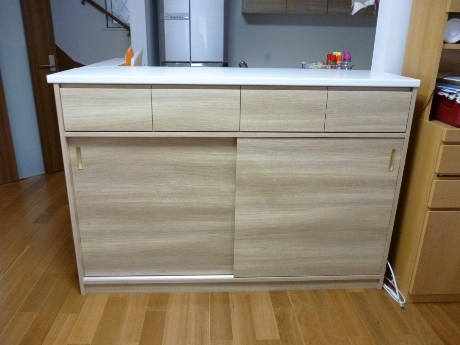 しかし、カウンター下収納は既存の天板の寸法が家具の収納力を左右します。既存天板の寸法・形状によっては十分な収納力を確保できない時もあります。