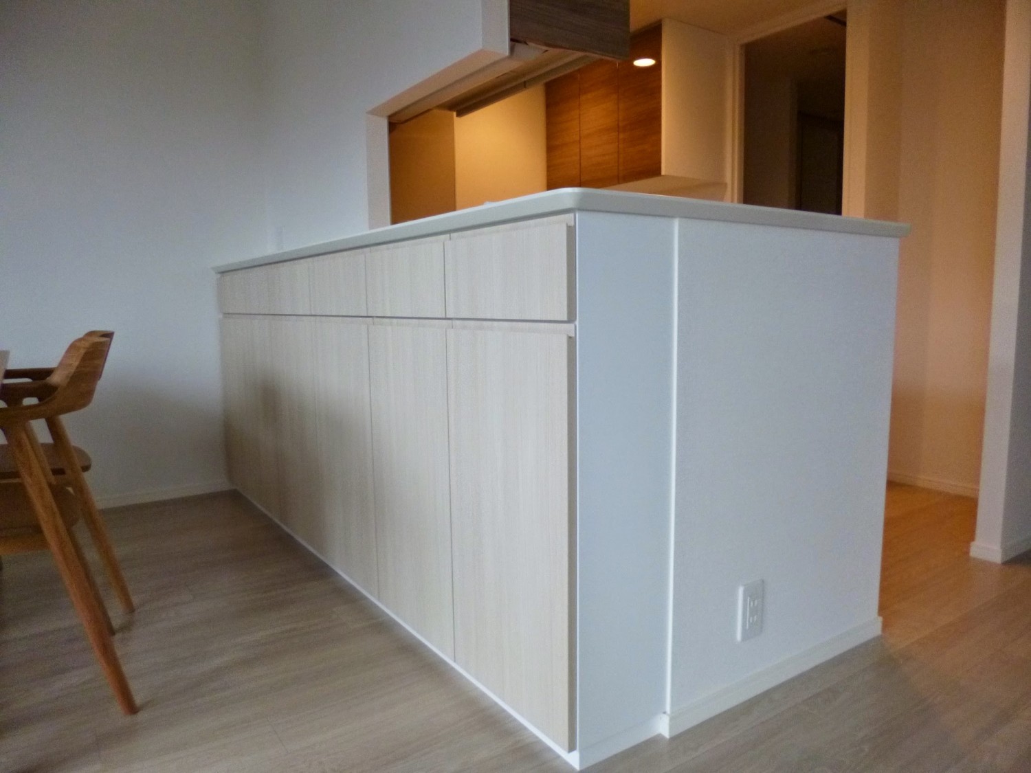 そんな時はカウンター下収納の根本である“カウンター下である”ことから視点を変え、既存天板の形状、寸法に左右されない納まりで対応をします。