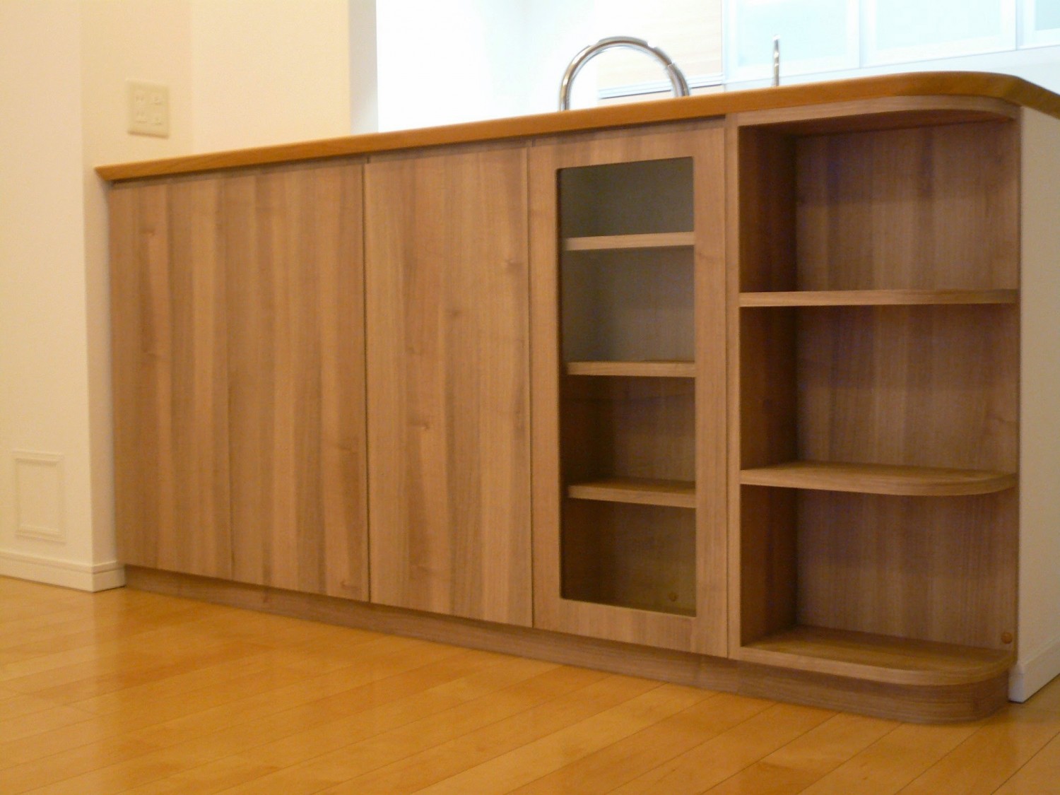 角をR形状に加工したオープン棚です。棚板は通常は固定式となりますが可動式にすることもできます。