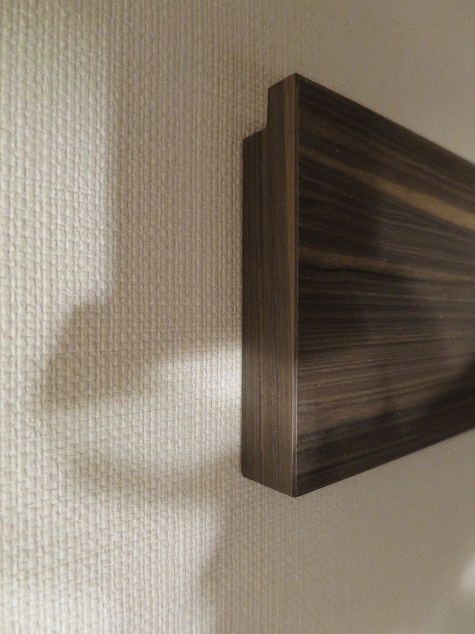 ドッコ式加工は桟木と本体を互いに引き寄せるので、壁とのスキマも無くキレイに納まるのが特徴です。(しかし、加工は結構大変です・・・)強度も十分に取れています。