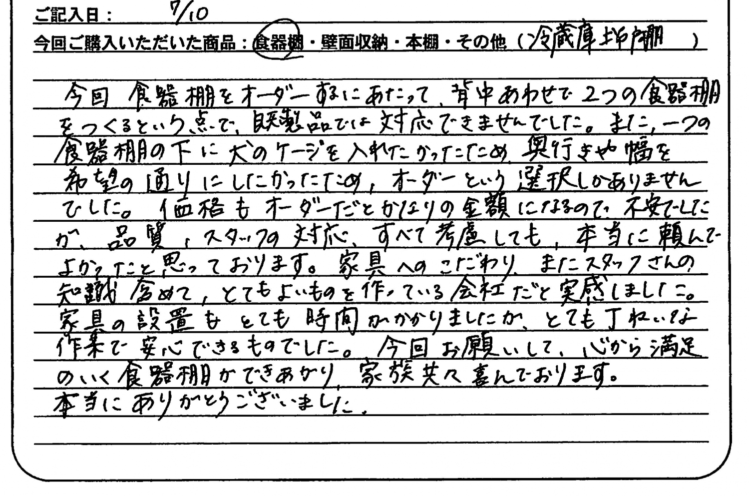 食器棚ができあがり、家族共々喜んでおります。
