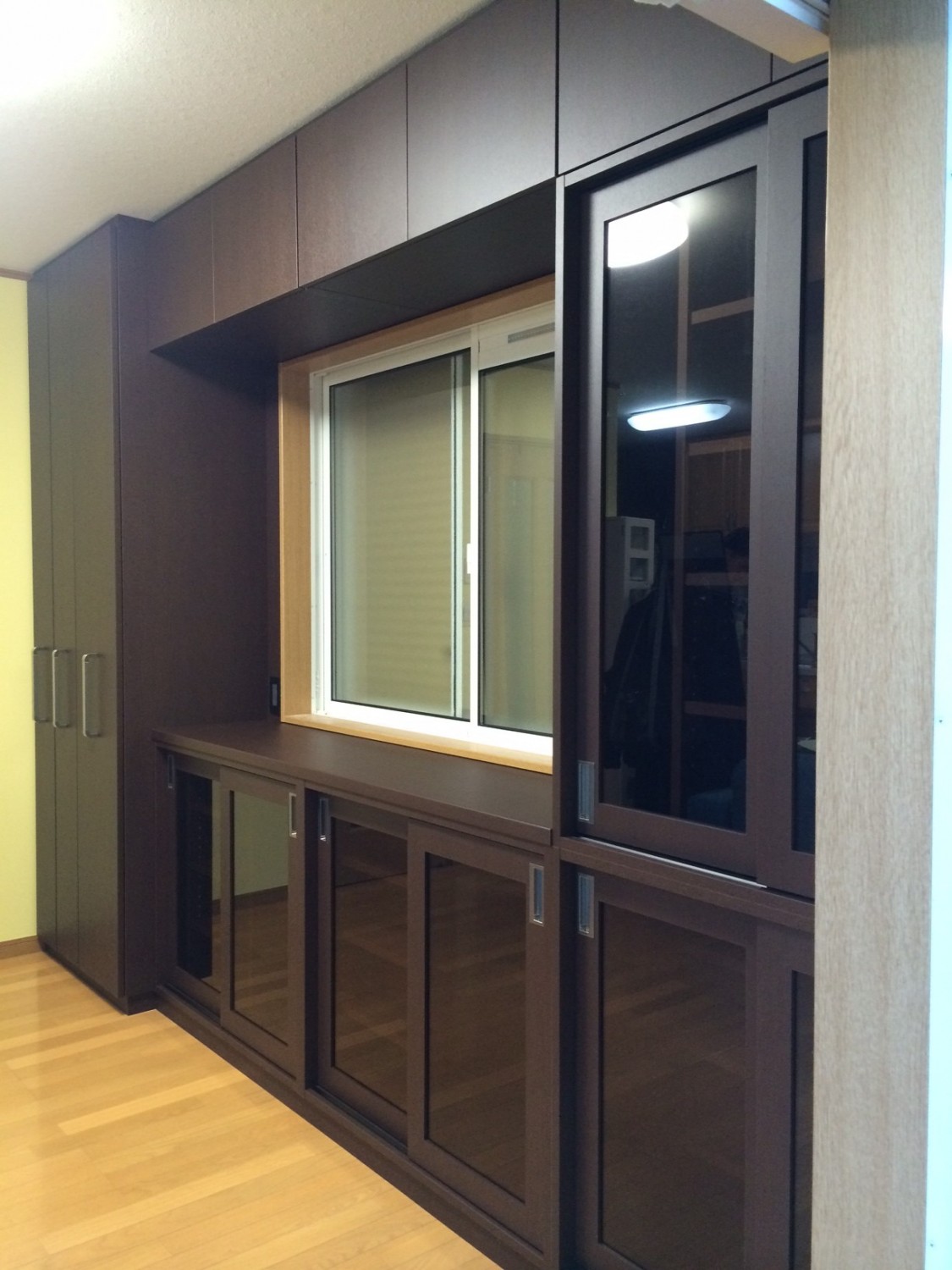 窓部分を除く壁一面の大容量の本棚です。通常、本棚は扉を付けないオープンタイプが主流なのですが今回はすべて扉付きです。扉付き(今回はガラスの引き戸がメイン)なので、コスト的には上がってしまうのですが、今回はリビング部分に設置ということもあり、落ち着いた雰囲気UPの効果と地震時の安心感につながります。